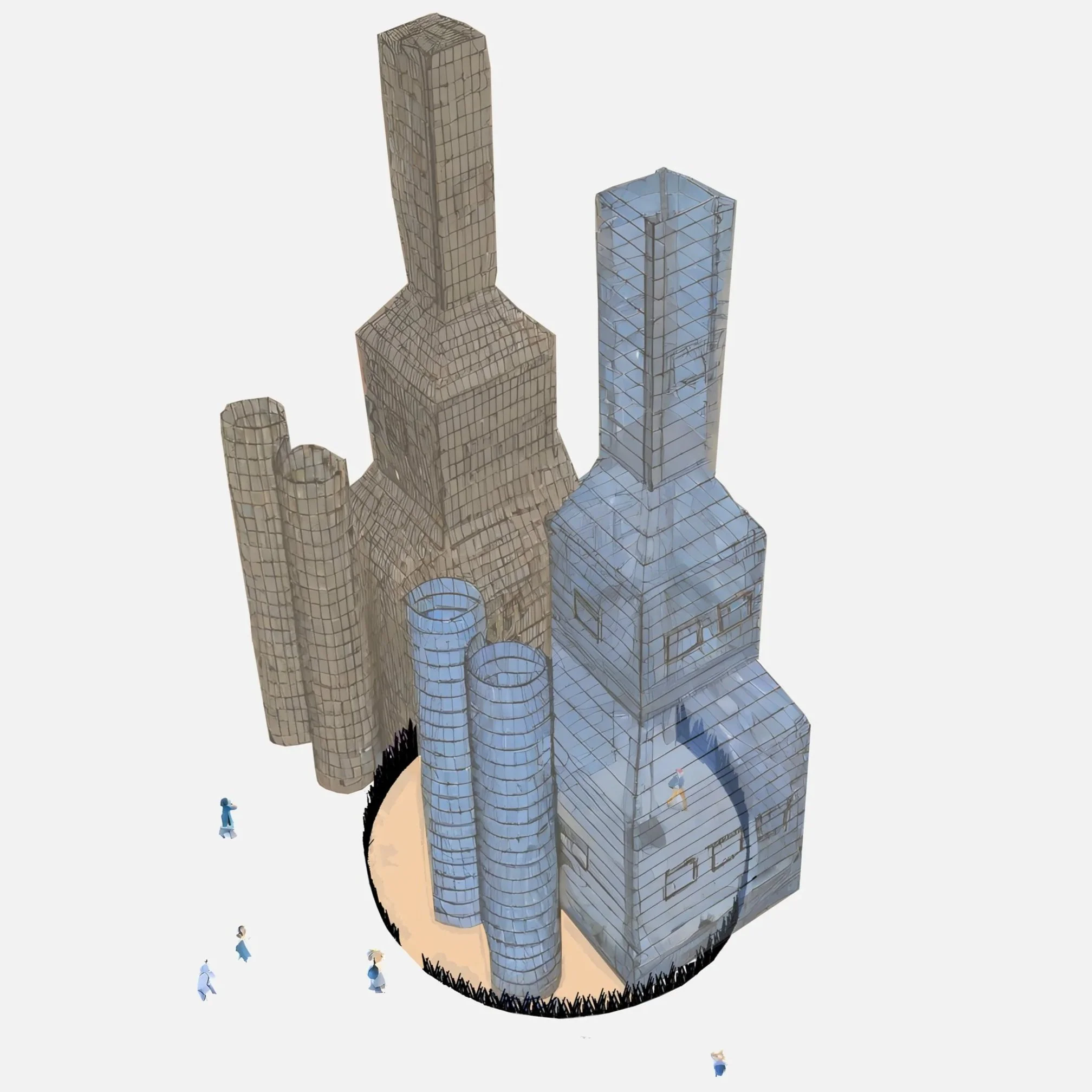 The Hejduk Towers and the City of Culture Building represent institutional architecture, emphasizing their monumentality and scale. The installation contrasts these characteristics with Galician domesticity, inspired by the traditional palloza, and draws a parallel between the towers and Hejduk's theory of duality, symbolizing the lar (living room) and the alcoba (bedroom).